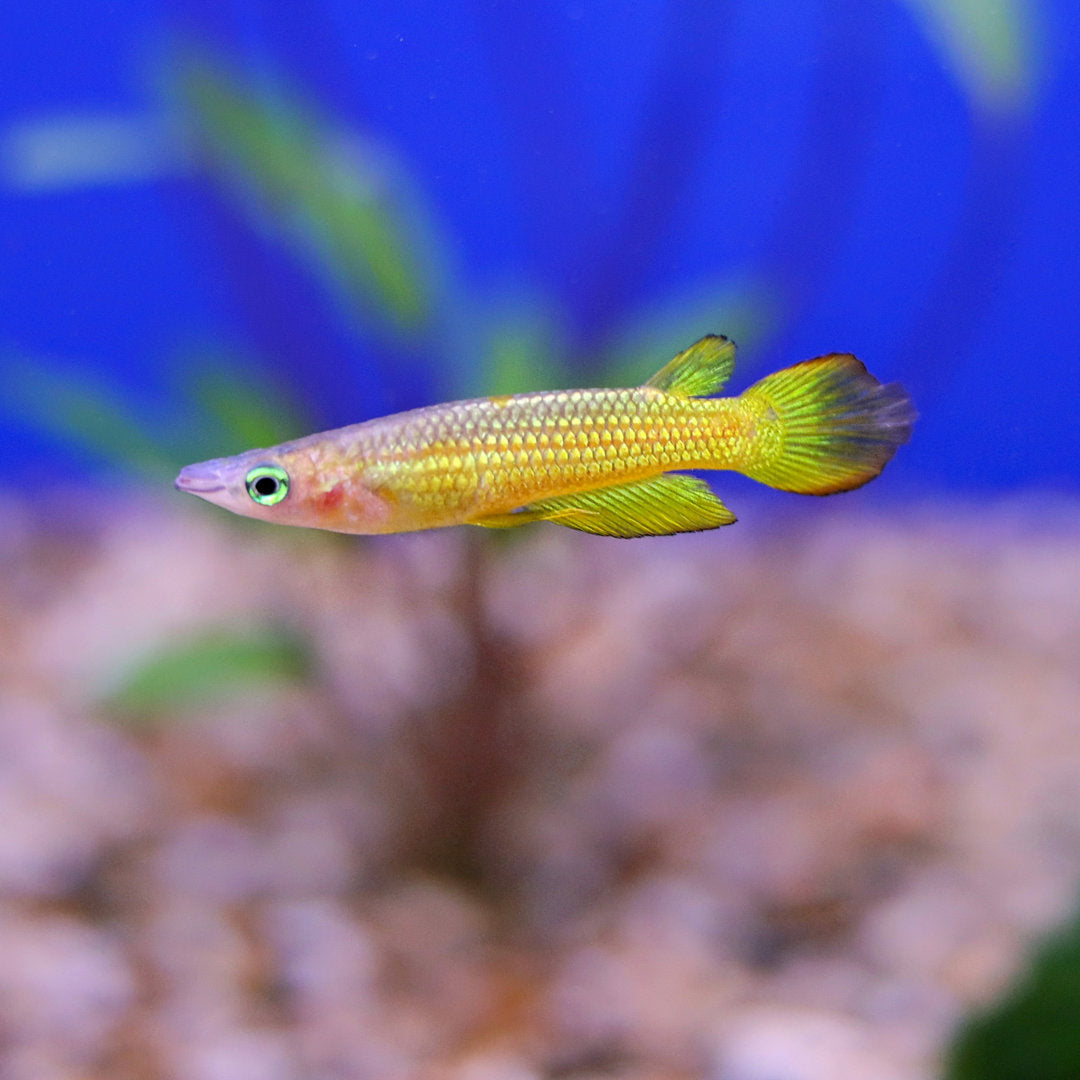 Add shimmer and motion to the top of your aquarium with the Golden Panchax, a striking killifish species native to India and Sri Lanka. Known for its elongated body, metallic gold sheen, and active surface behavior, this fish is both beautiful and bold. A true predator in miniature, itβs best suited for aquarists who appreciate unique behavior and vibrant coloration.