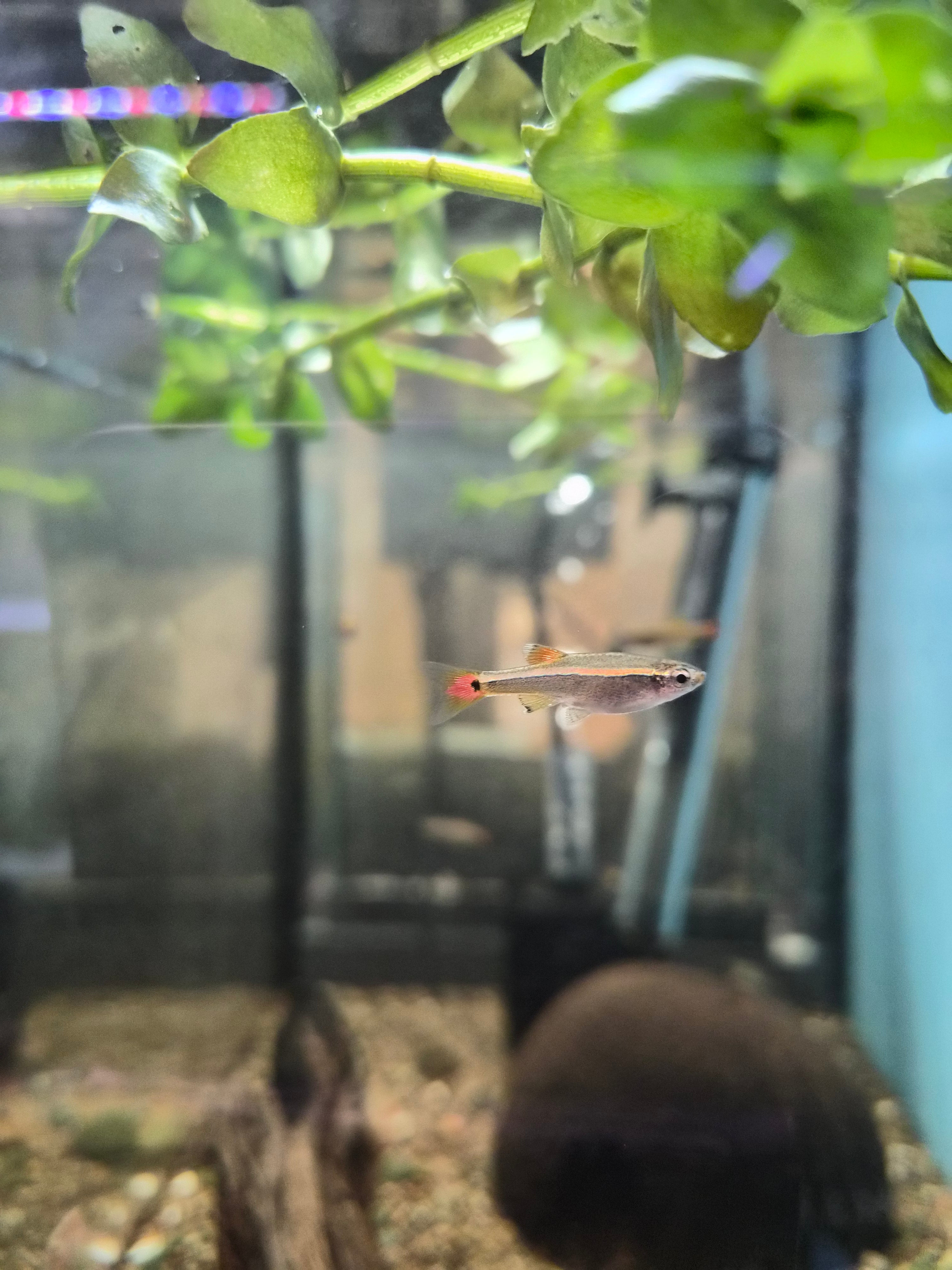 The White Cloud Mountain Minnow (Tanichthys albonubes) is a peaceful, colorful freshwater fish native to the cool mountain streams of China and Vietnam. A long-time favorite for both beginner and experienced aquarists, White Clouds are known for their hardiness, ease of care, and vibrant coloration—featuring a shimmering silver body, iridescent stripe, red fins, and golden highlights.